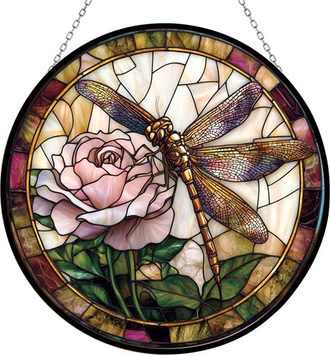 365CUSGIFTS Victorian Dragonfly And Rose Window Stained Glass Window Hanging Customized Suncatcher 12" Glass Panel With Metal Chain Sun Catchers Wall
