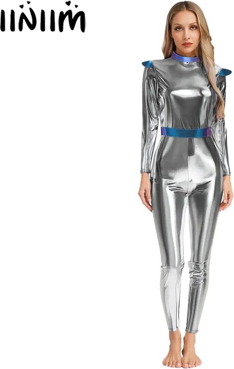 Women Metallic Robot Costume Halloween Carnival Party Cosplay Alien Costume Long Sleeves Dress Shiny